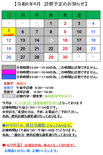 令和8年4月の診察予定カレンダー